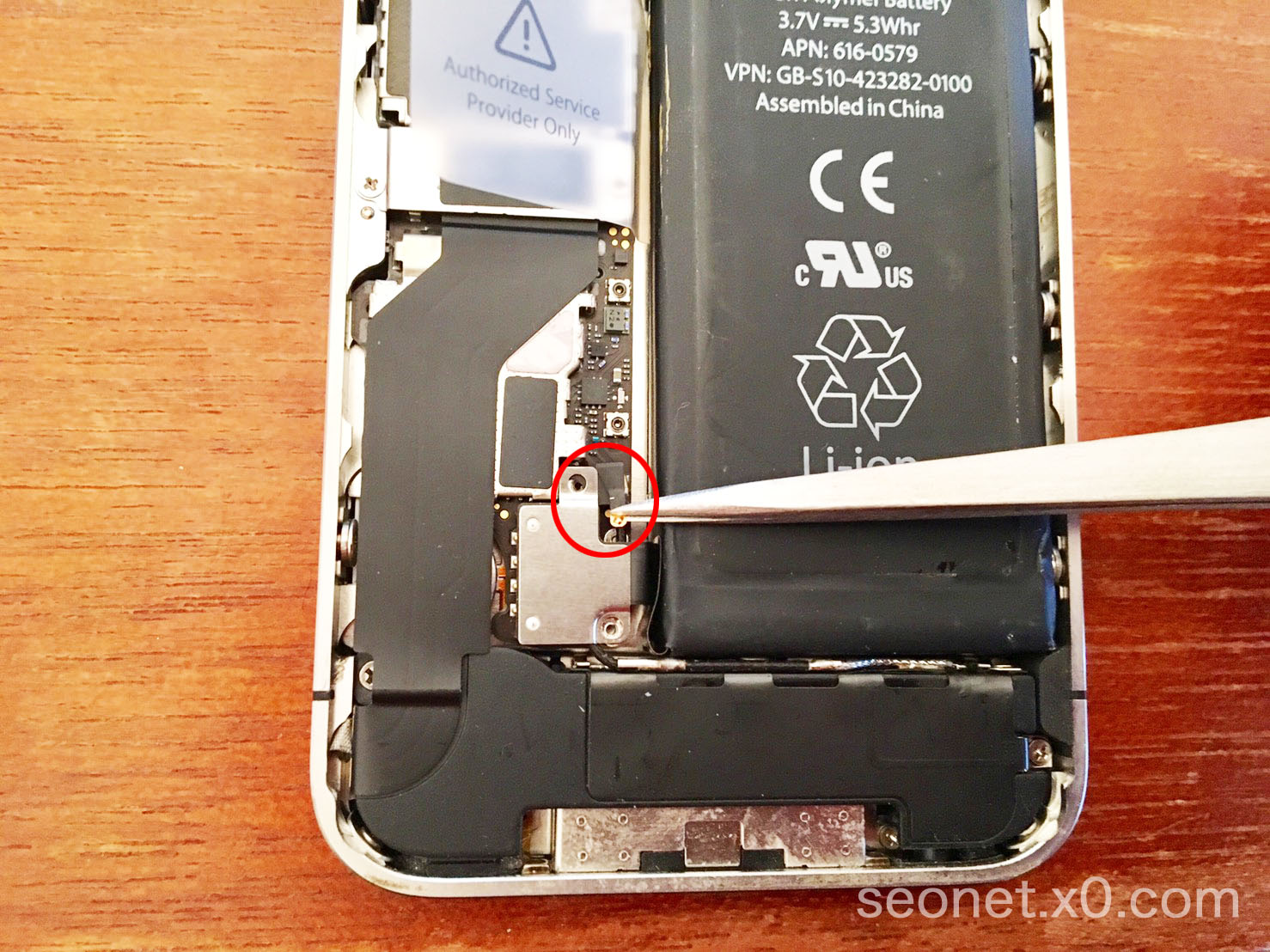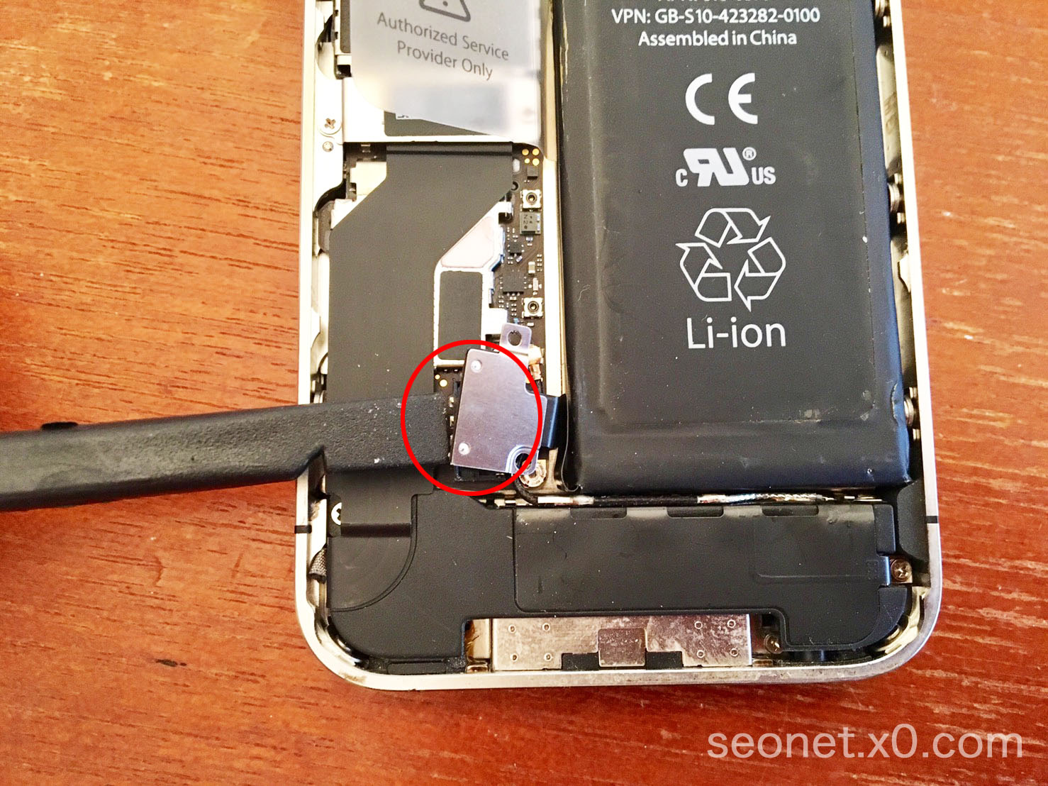 本体からバッテリーを取り外します。付属の黒いヘラみたいなもので外してください。