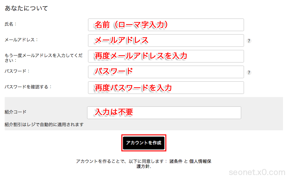 名前、メールアドレス、パスワードを入力し、「アカウント作成」をクリックします。