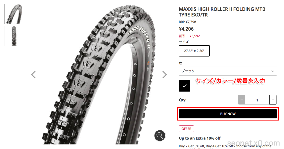 カートに追加する際はサイズや色、数量を選んで「BUY NOW」をクリックします。