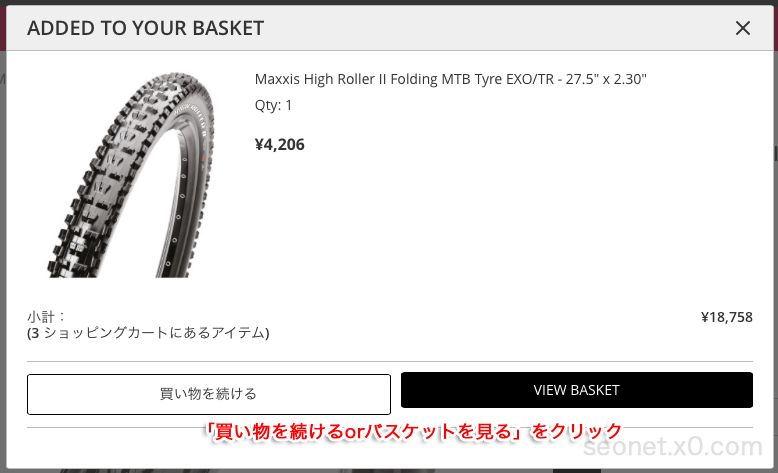 買い物を続ける場合は左側を、バスケットを見る場合は右側をクリックします。