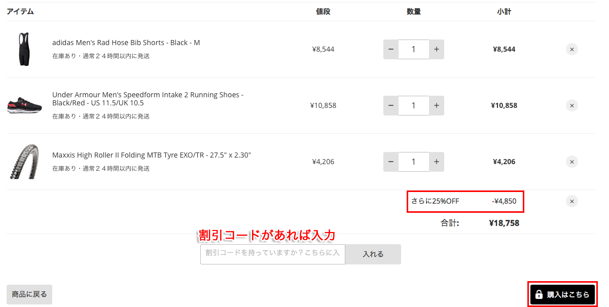 今回はProbikekitについて書いていくのですが、安いといっても時期やクーポン入力によって大きく異なってくるので注意が必要です。
