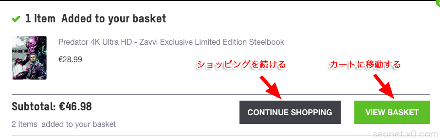 ポップアップでこのように表示されます。「CONTINUE SHOPPING」は「ショッピングを続ける」の意味で、「VIEW BASKET」は「カートを見る」の意味です。