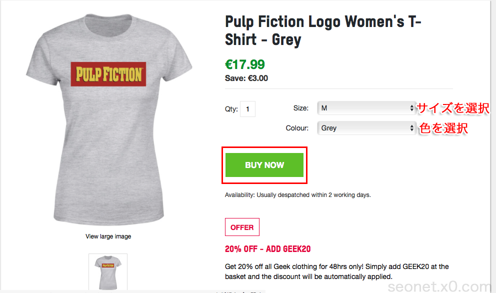 もう一つ商品をカートに入れてみます。Tシャツの場合だと、サイズと色を選択します。良ければ「BUY NOW」をクリックします。