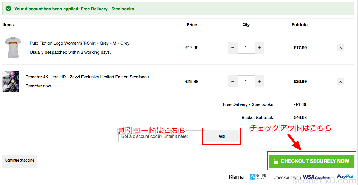 購入する前は数量や購入価格を確認しておきましょう。この画面でクーポンコードを入力すると割引が適用されます。先ほどの「GEEK20」や私の紹介コード「SEIYA-R2」を入れると安く買えるようになります。(入力は任意です)