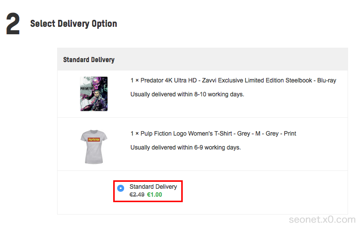 住所を入力したら、次に配送を選択します。この注文では送料は£1ですね。