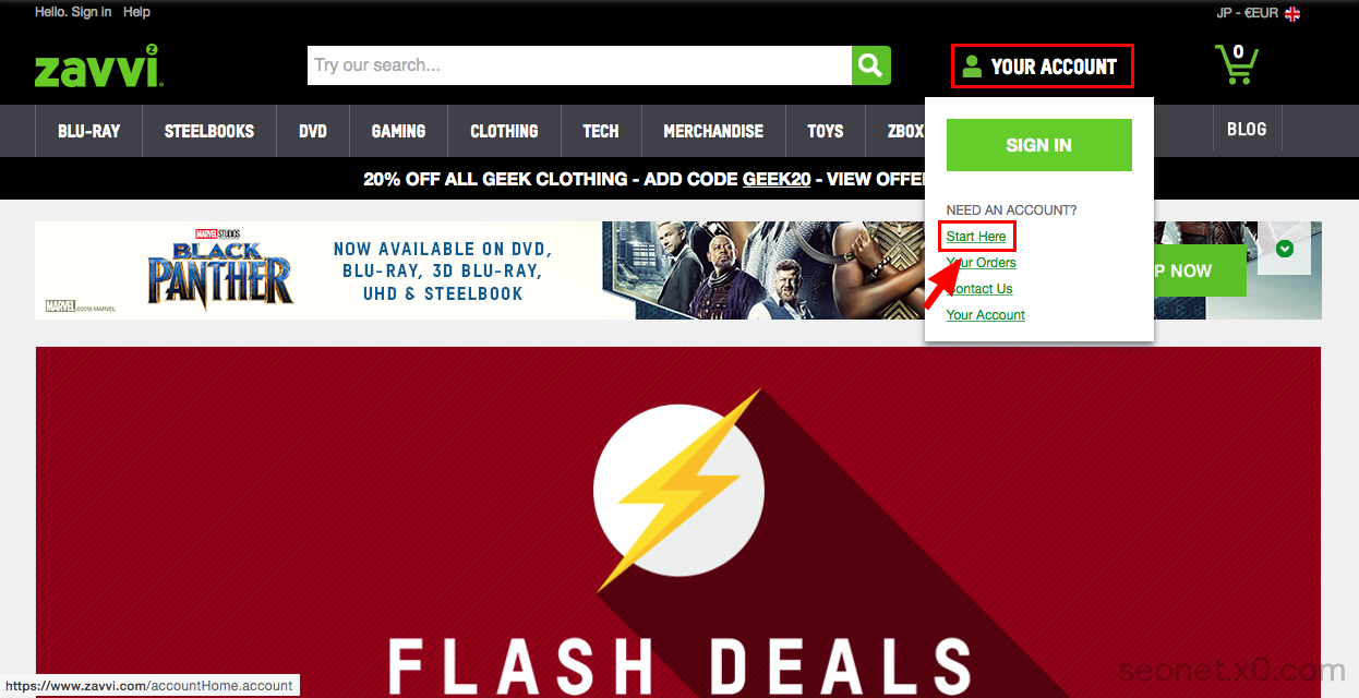 まずアカウントを作成していない方は新規アカウントを作成するために「YOUR ACCOUNT」から「Start Here」をクリックします。
