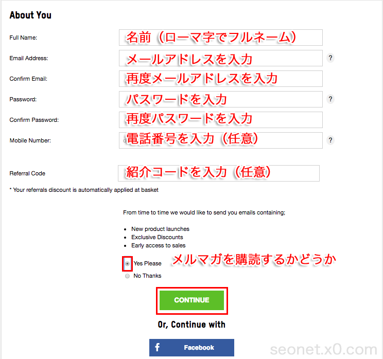 下記の通り、メールアドレスやパスワードなどの必要事項を入力します。