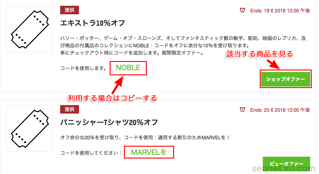 こちらの画面でセール情報を確認することができます。利用するにはコードをコピーしてカート画面で入力します。(詳しくは後ほど説明します)